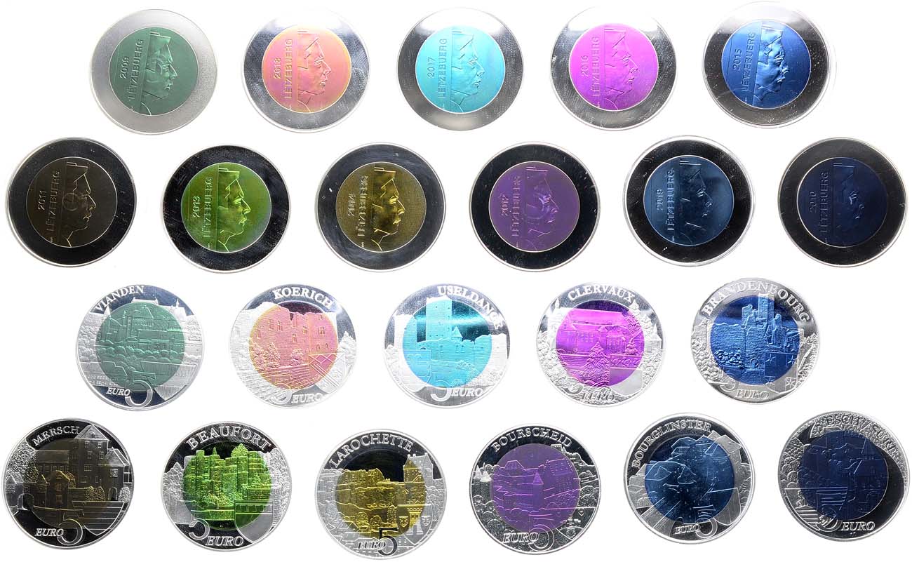5 евро 2009 года. Замки Люксембурга - Замок Вианден. Биметалл. (серебро/ниобий). Тираж 7500 экз. КМ 108. PROOF. 5 евро 2010 года. Замки Люксембурга - Замок Эш-сюр-Сюр. Биметалл. (серебро/ниобий). Тираж 3000 экз. КМ 111. PROOF. 5 евро 2011 года. Замки Люксембурга - Замок Мерш. Биметалл. (серебро/ниобий). Тираж 3000 экз. КМ 117. PROOF. 5 евро 2012 года. Замки Люксембурга - Замок Буршайд. Биметалл. (серебро/ниобий). Тираж 3000 экз. КМ 123. PROOF. 5 евро 2013 года. Замки Люксембурга - Замок Бофор. Биметалл. (серебро/ниобий). Тираж 3000 экз. КМ 126. PROOF. 5 евро 2014 года. Замки Люксембурга - Замок Ларошет. Биметалл. (серебро/ниобий). Тираж 3000 экз. КМ 133. PROOF. 5 евро 2015 года. Замки Люксембурга - Замок Бранденбург. Биметалл. (серебро/ниобий). Тираж 3000 экз. КМ 141. PROOF. 5 евро 2016 года. Замки Люксембурга - Замок Клерво. Биметалл. (серебро/ниобий). Тираж 3000 экз. КМ 145. PROOF. 5 евро 2017 года. Замки Люксембурга - Замок Юзельданж. Биметалл. (серебро/ниобий). Тираж 3000 экз. КМ 201. PROOF. 5 евро 2018 года. Замки Люксембурга - Замок Кёрих. Биметалл. (серебро/ниобий). Тираж 3000 экз. КМ 202. PROOF. 5 евро 2019 года. Замки Люксембурга - Замок Бурглистер. Биметалл. (серебро/ниобий). Тираж 3000 экз. КМ 212. PROOF. PROOF.