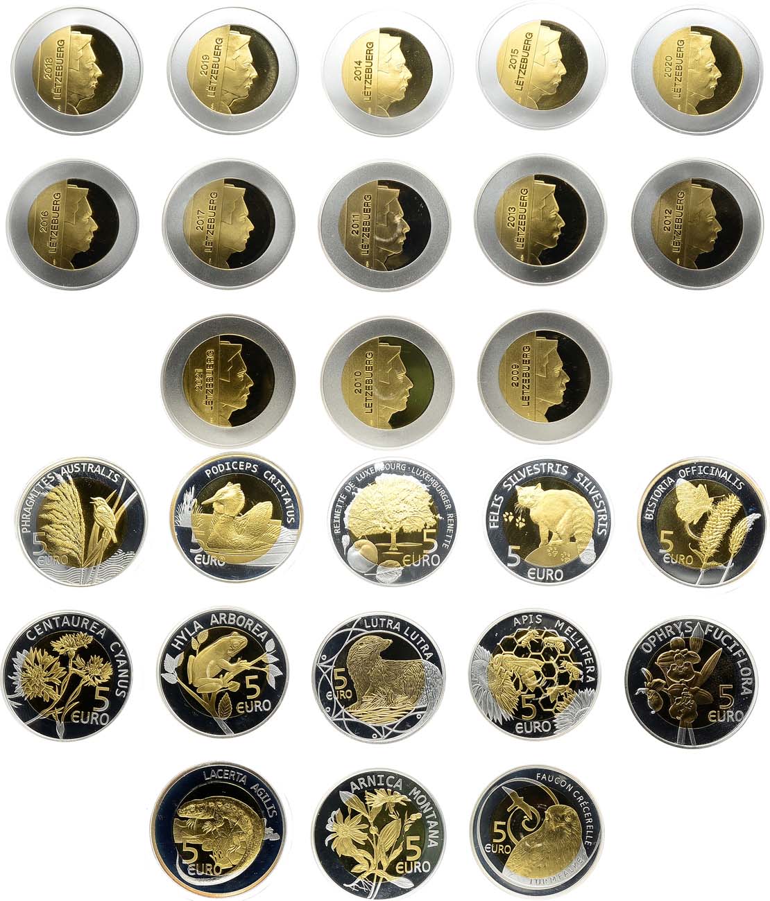 Биметалл. Би-металл: центр - нордик, кольцо - серебро 0.925 пробы. Люксембург. 5 евро 2009 года. Обыкновенная пустельга. KM 109. PROOF. Люксембург. 5 евро 2010 года. Арника горная. KM 112. PROOF. Люксембург. 5 евро 2011 года. Выдра. KM 118. PROOF. Люксембург. 5 евро 2012 года. Орхидея Ophrys fuciflora. KM 124. PROOF. Люксембург. 5 евро 2013 года. Медоносная пчела (Apis mellifera). KM 127. PROOF. Люксембург. 5 евро 2014 года. Ренет. KM 200. PROOF. Люксембург. 5 евро 2015 года. Среднеевропейский лесной кот (Felis silvestris silvestris). KM 205. PROOF. Люксембург. 5 евро 2016 года. Василёк синий (Centaurea cyanus). KM 219. PROOF. Люксембург. 5 евро 2017 года. Обыкновенная квакша (Hyla arborea). KM 208. PROOF. Люксембург. 5 евро 2018 года. Тростник обыкновенная̆. KM 203. PROOF. Люксембург. 5 евро 2019 года. Большая поганка, или чомга (Podiceps cristatus). KM 213. PROOF. Люксембург. 5 евро 2020 года. Змеевик большой (Bistorta officinalis). KM 210. PROOF. Люксембург. 5 евро 2021 года. Прыткая ящерица (Lacerta agilis). KM 215. PROOF. PROOF.