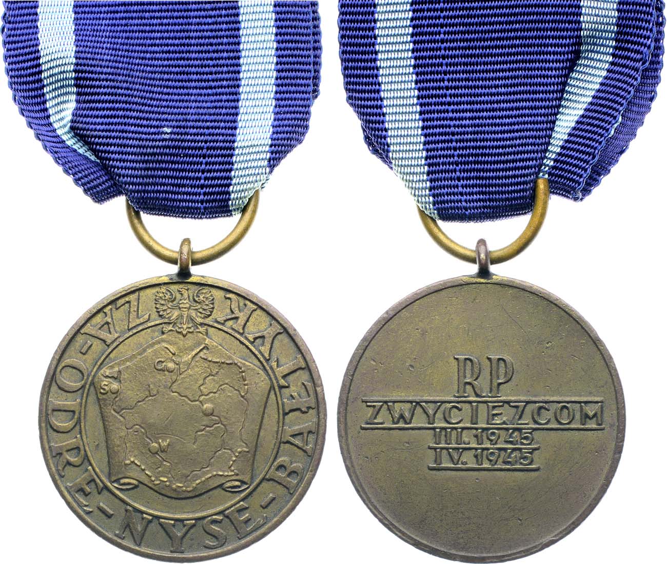 Бронза. Диаметр 33 мм. Аверс: изображение польского некоронованного орла, держащего в когтях свиток с картой польских земель, отображающей основные водные магистрали. Надпись по окружности на польском языке ZA ODRĘ, NISSĘ, BAŁTYK (русский перевод; ЗА ОДРУ—НИСУ — БАЛТИКУ). Реверс: надпись на польском языке RP / ZWYCIĘZCOM (русский перевод; РЕСПУБЛИКА ПОЛЬША / ПОБЕДИТЕЛЯМ), даты III.1945 / IV.1945. Муаровая лента состоит из пяти вертикально расположенных полос, синего и белого цвета. UNC.