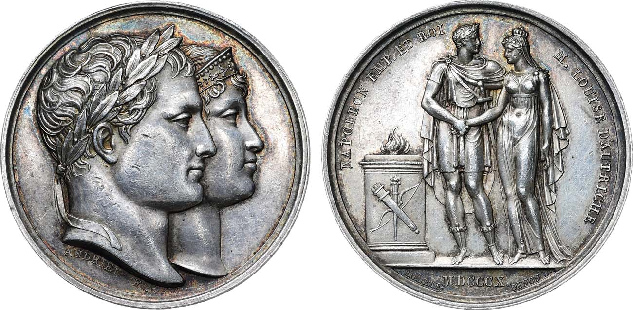 Серебро. 17,15г. Диаметр 32,8 мм. Парижский монетный двор. Медальеры - Б. Андриё (на аверсе под обрезом портрета императора "ANDRIEU F.") и Н.-Г. Брене (на реверсе под обрезом изображения "BRENET F. DENON D.") под руководством Денона. Гравировка на гурте "DONNE PAR S.M.J.R. A J.B. BECHET SECR GENERAL DU JURA." - "Подарено сеньором Ж.Б. Беше, генеральным секретарём Юра". Bramsen 954. AU.