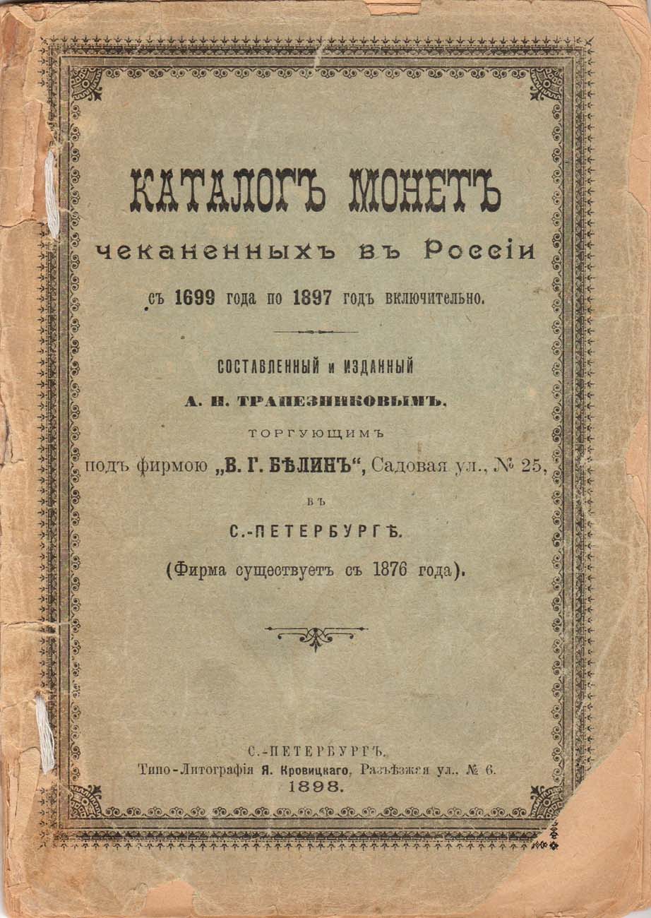 СПБ, 1898 г. 104 стр. №3. Торговый каталог фирмы "В.Г. Белин" (ул. Садовая, д.25, г. Санкт-Петербург), под редакцией А.Н. Трапезникова. В каталоге предлагаются монеты Императорской России всех номиналов по годам, начиная с монет периода Петра I. Большой интерес представляют цены, которые отражают рынок на русские монеты в 1898 году.