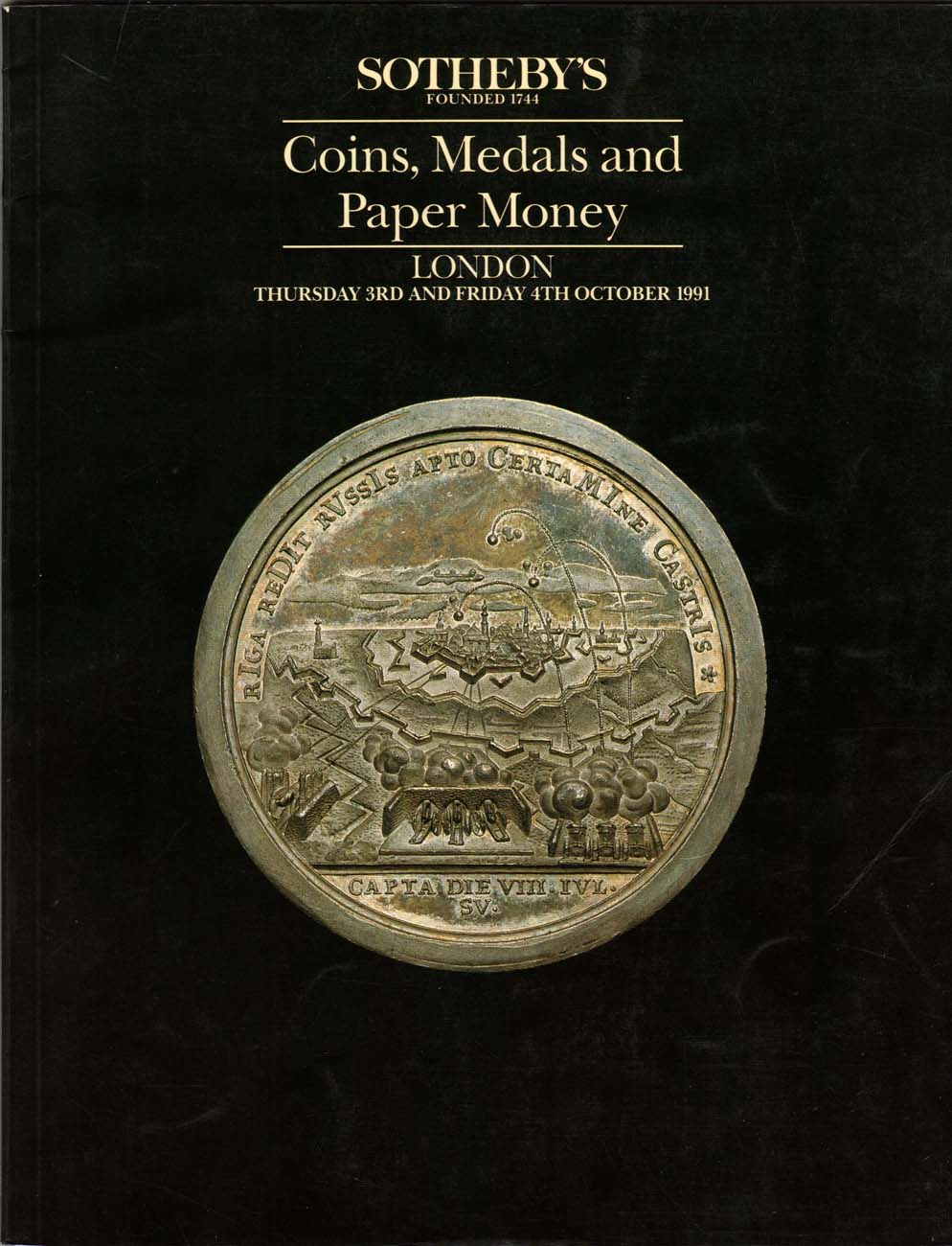 Лондон, 3-4 октября 1991 года. 860 лотов. Коллекция русских исторических медалей, преимущественно в серебре. Более 50 лотов русских серебряных медалей в необыкновенно высокой коллекционной сохранности.