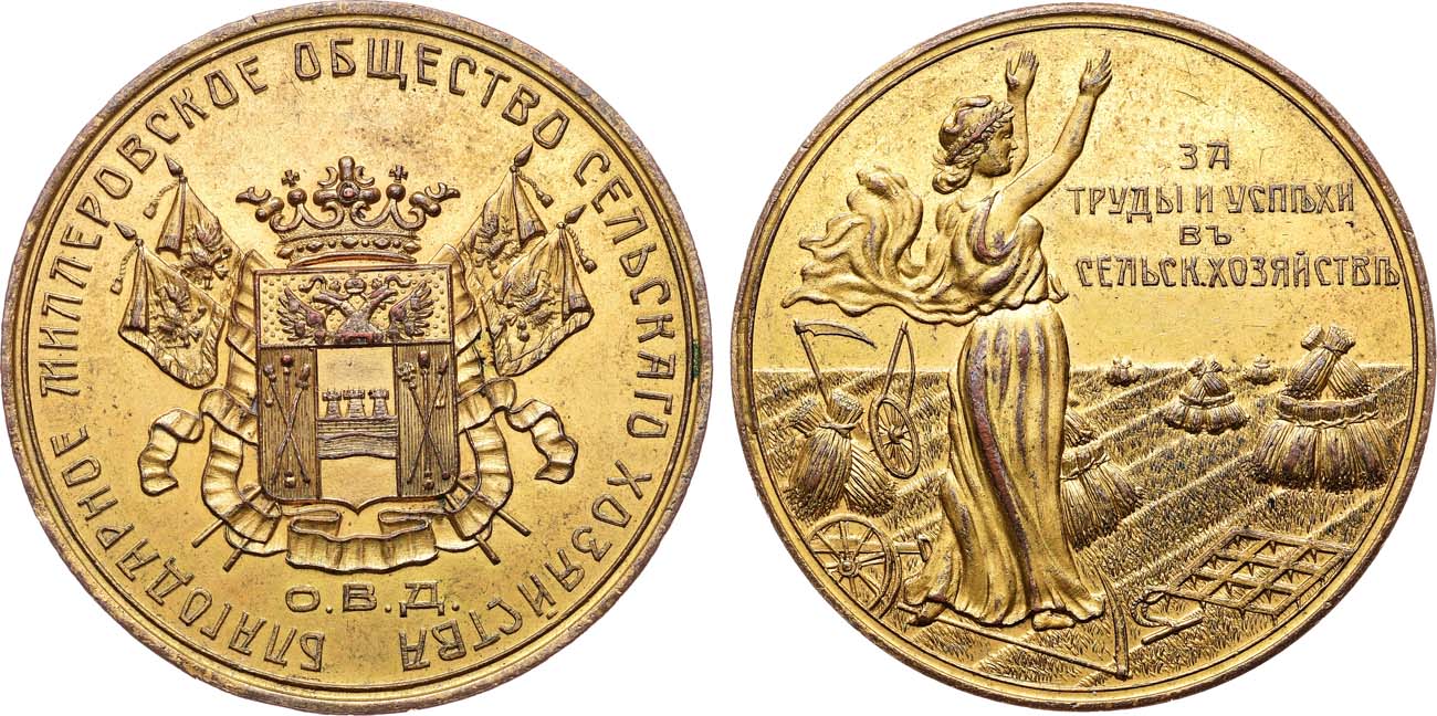 Бронза, золочение. 62,35г. Диаметр 48 мм. Российская Империя, начало XX в. Неизвестная мастерская. Без подписи медальера. Аверс: герб области Войска Донского, под ним надпись "О.В.Д.", по окружности надпись "БЛАГОДАРНОЕ МИЛЛЕРОВСКОЕ ОБЩЕСТВО СЕЛЬСКОГО ХОЗЯЙСТВА". Реверс: богиня плодородия Цецера, воздевшая руки к небу, у её ног коса и борона, стоит на убранном поле пшеницы, справа надпись в четыре строки "ЗА | ТРУДЫ И УСПѢХИ | ВЪ | СЕЛЬСК.ХОЗЯЙСТВѢ". Букатина 76.1. Дьяков 1464.2(R2). AU.