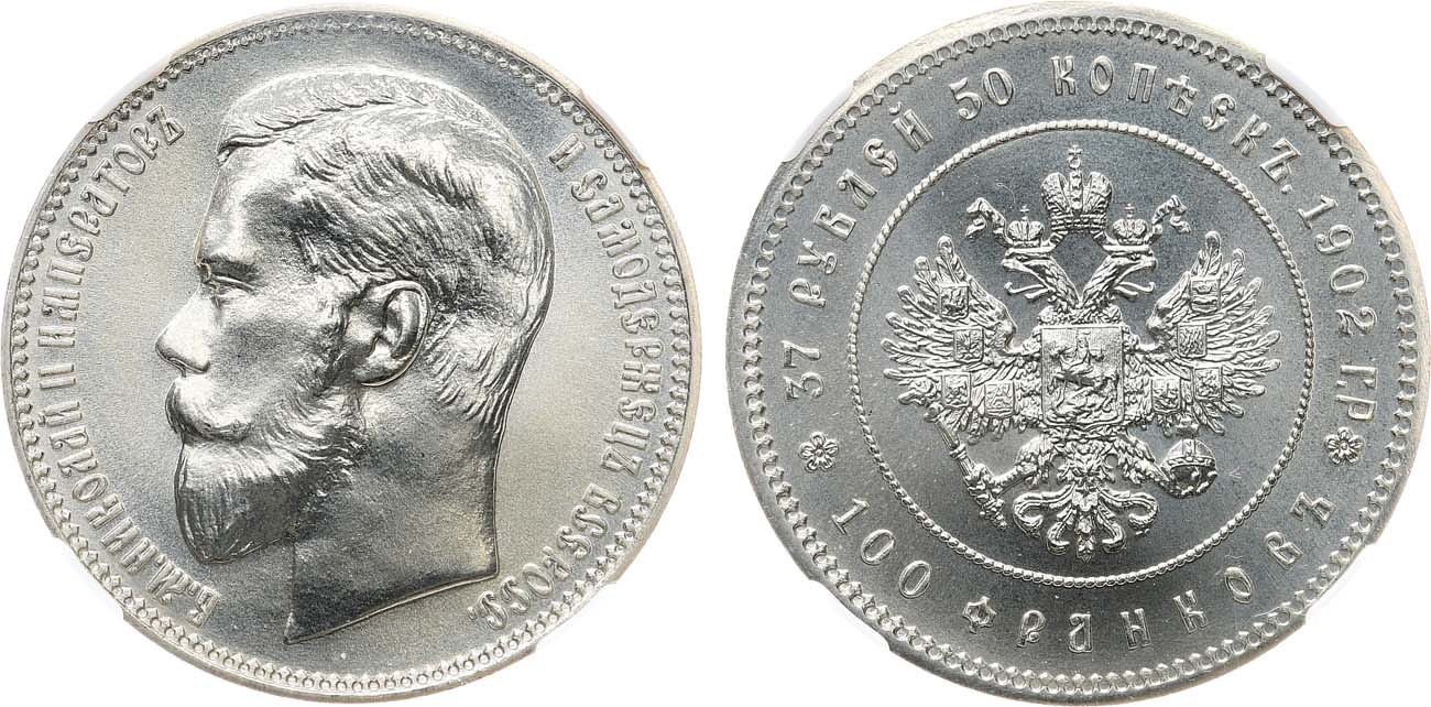 В 1990 году на Ленинградском монетном дворе в медно-никелевом исполнении, тиражом 50 000 штук были изготовлены реплики монеты 37 рублей 50 копеек - 100 франков. М.И. Смирнов писал о них: «… к новоделам, впрочем, с некоторой натяжкой, можно отнести изготовленные в 1990 году в медно-никелевом сплаве монеты с двойным обозначением номинала: „37 рублей 50 копеек - 100 франков“ 1902 года, отнесенные нумизматами к разряду донативных … Для обозначения их „новодельности“ на оборотной стороне проставлена литера „Р“, в данном случае расшифровываемая, как реплика или повторение»