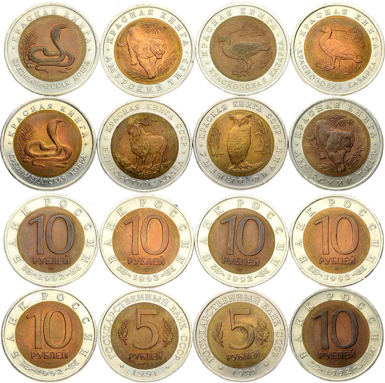 Биметалл. 5 рублей 1991 года. Винторогий козёл. 5,92 г. Ленинградский монетный двор. Тираж: 550.000 экз. UNC. 5 рублей 1991 года. Рыбный филин. 6,01 г. Ленинградский монетный двор. Тираж: 550.000 экз. UNC. 10 рублей 1992 года. Амурский тигр. 5,89 г. Ленинградский монетный двор. Тираж: 300.000 экз. UNC. 10 рублей 1992 года. Амурский тигр. 5,93 г. Ленинградский монетный двор. Тираж: 300.000 экз. UNC. 10 рублей 1992 года. Краснозобая казарка. 5,89 г. Ленинградский монетный двор. Тираж: 300.000 экз. UNC. 10 рублей 1992 года. Краснозобая казарка. 5,97 г. Ленинградский монетный двор. Тираж: 300.000 экз. UNC. 10 рублей 1992 года. Среднеазиатская кобра. 6,06 г. Ленинградский монетный двор. Тираж: 300.000 экз. UNC. 10 рублей 1992 года. Среднеазиатская кобра. 5,82 г. Ленинградский монетный двор. Тираж: 300.000 экз. UNC. UNC.