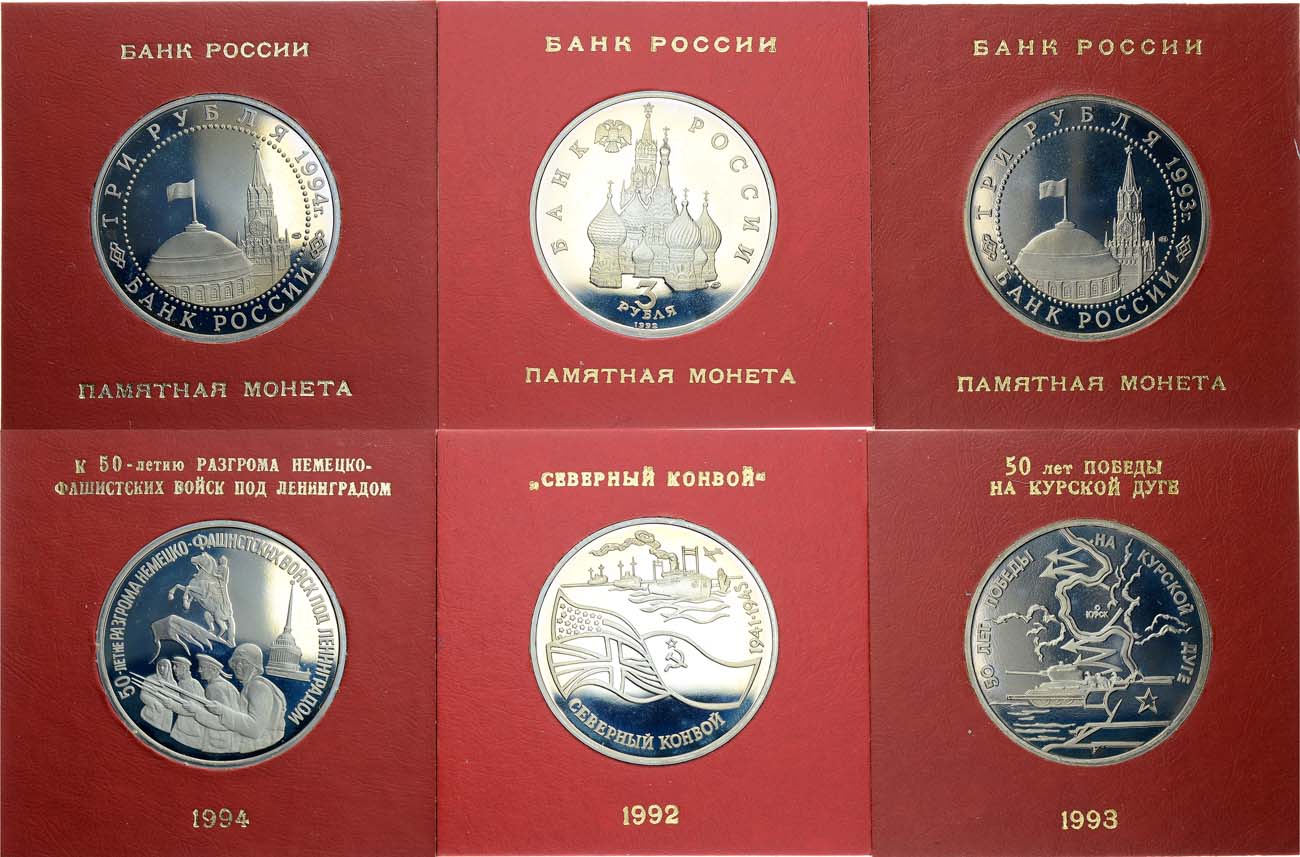 Медно-никелевый сплав. Ленинградский монетный двор. 3 рубля 1992 года. Северный конвой. ЦБ РФ 5011-0003. 3 рубля 1993 года. 50-летие Победы на Курской дуге. ЦБ РФ 5011-0006. 3 рубля 1994 года. 50-летие разгрома немецко-фашистских войск под Ленинградом. ЦБ РФ 5011-0008. PROOF.