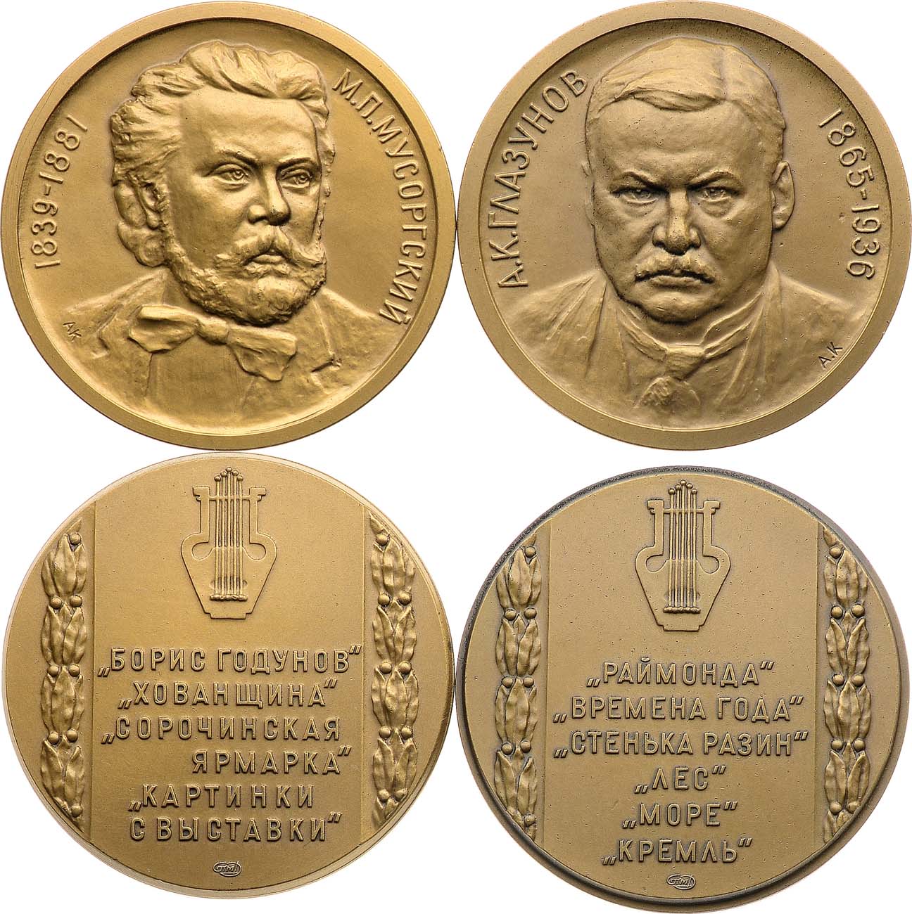 Томпак. Медаль. Диаметр 39 мм. Томпак. 31,09 г. М. Мусоргский. СПМД. Медальер "А.К.". UNC. Медаль. Диаметр 39 мм. Томпак. 31,73 г. А. Глазунов. СПМД. Медальер "А.К.". UNC.