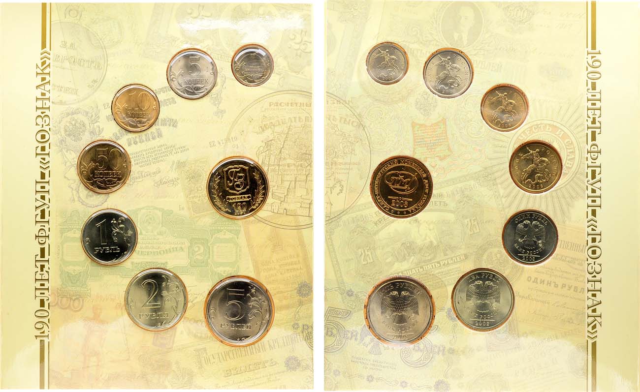 Жетон 2008 года. СПМД. 190 лет ГОЗНАКУ. 1 копейка 2008 года. СПМД. сталь плакированная медно-никелем. 5 копеек 2008 года. СПМД. сталь плакированная медно-никелем. 10 копейка 2008 года. СПМД. сталь плакированная латунью. 50 копейка 2008 года. СПМД. сталь плакированная латунью. 1 рублей 2008 года. СПМД. медно-никель. 2 рубля 2008 года. СПМД. медно-никель. 5 рублей 2008 года. СПМД. медно-никель. BU.