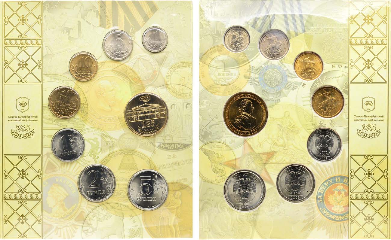 Жетон 285 лет Санкт-Петербургскому монетному двору. 1 копейка 2009 года. СПМД. сталь плакированная медно-никелем. 5 копеек 2009 года. СПМД. сталь плакированная медно-никелем. 10 копейка 2009 года. СПМД. сталь плакированная латунью. 50 копейка 2009 года. СПМД. сталь плакированная латунью. 1 рублей 2009 года. СПМД. никелированная сталь. 2 рубля 2009 года. СПМД. никелированная сталь. 5 рублей 2009 года. СПМД. никелированная сталь. BU.