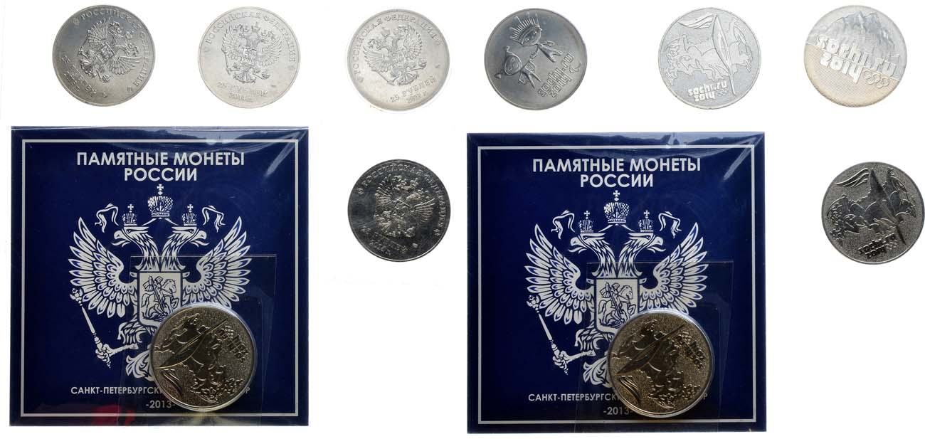 Медно-никелевый сплав. 10г. 25 рублей 2011 года. СПМД. Запайка. XXII зимние Олимпийские Игры и XI зимние Паралимпийские Игры, Сочи 2014 - Эмблема. ЦБ РФ: 5015-0001. UNC. 25 рублей 2013 года. СПМД. Запайка. Талисманы и логотип XI Паралимпийских зимних игр Сочи 2014 (Лучик и Снежинка). ЦБ РФ: 5015-0005. UNC. 25 рублей 2014 года. СПМД. Запайка. Эстафета Олимпийского огня Сочи 2014. ЦБ РФ: 5015-0007. UNC. 3 шт.
