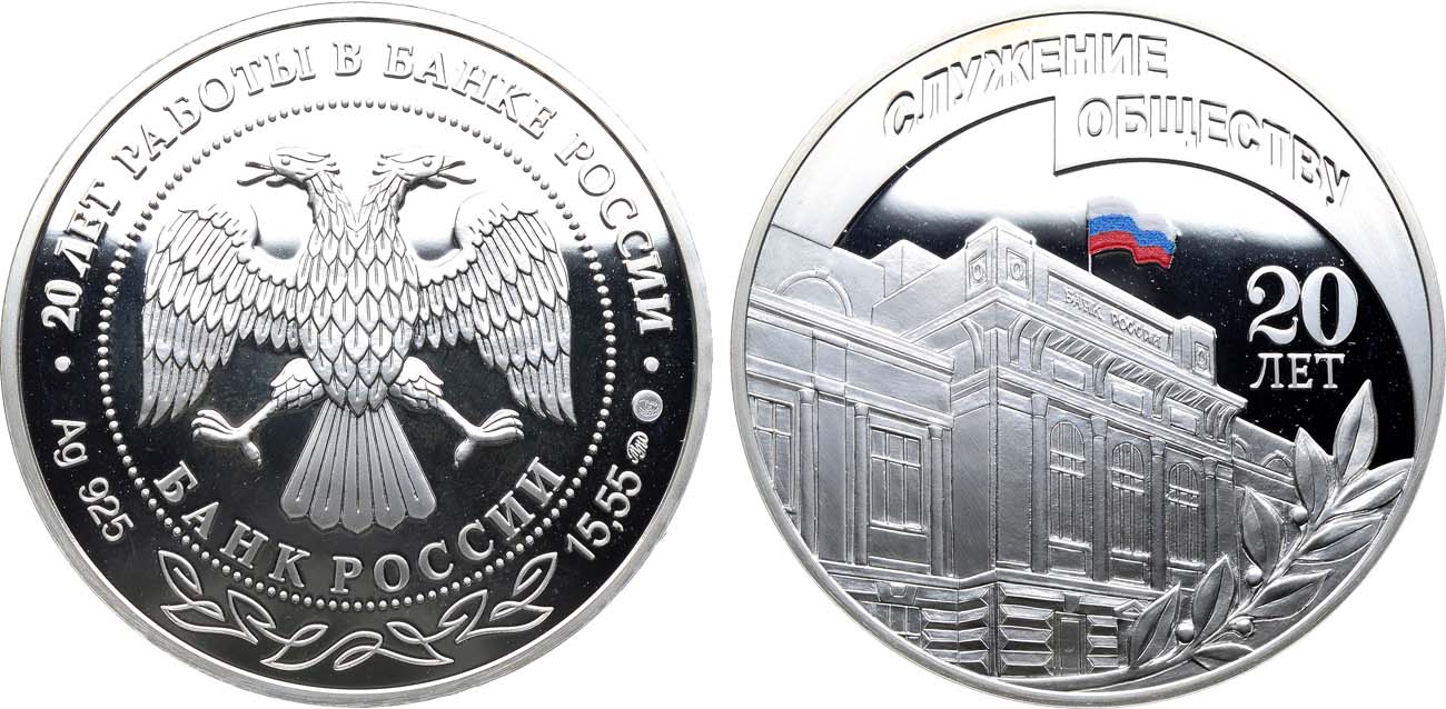 Серебро. 16,97г. Диаметр 33 мм. Московский монетный двор. Цветное покрытие. Аверс: клеймо "женская голова в кокошнике вправо". Гурт: повторяющаяся надпись "20 лет". PROOF.
