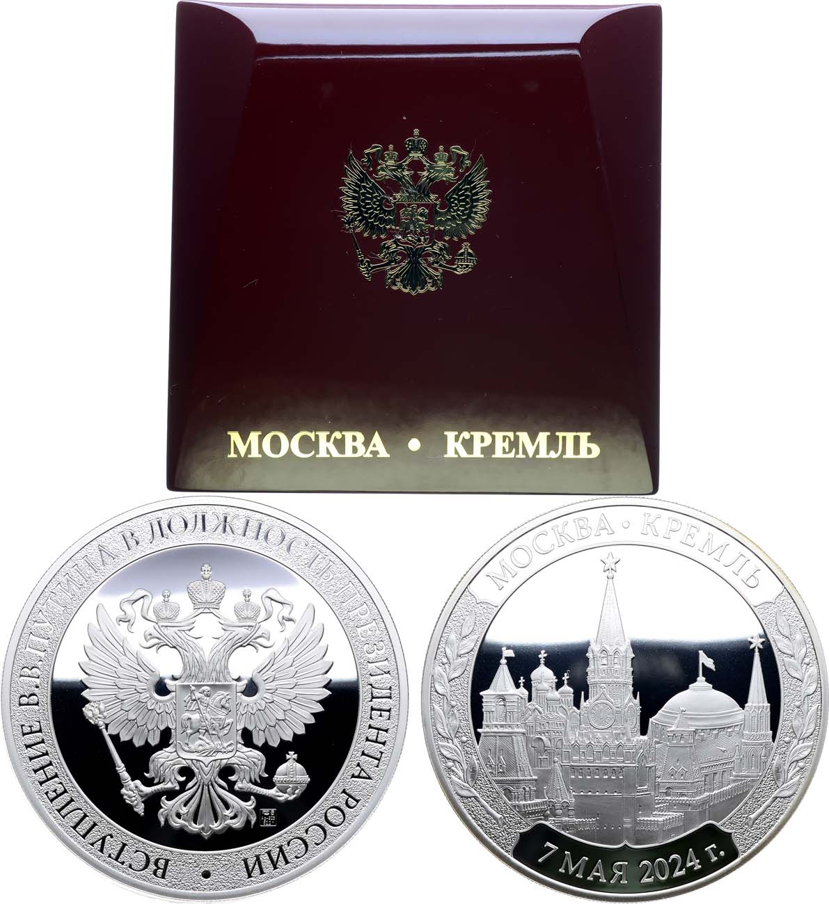 Серебро 925 пробы. 67,2г. Диаметр 50 мм. Санкт-Петербургский монетный двор. Реверс: внизу справа клеймо «СПМД, женская голова в кокошнике / Ag-925 / 67,20 г» PROOF.