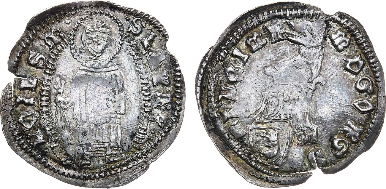 Серебро. 1,17г. Город Бар. Аверс: фамильный герб Балшичей (рыцарский шлем с короной, обращённый влево, с навершием в виде волчьей головы, под шлемом щит с головой волка) в круговой надписи на латыни "MD GORGI STRACIMR". Реверс: святой Лаврентий, держащий в правой руке лампаду, в левой руке Евангелие в круговой надписи на латыни "•S LΛVRE• •NCIVSM•". AU/UNC.