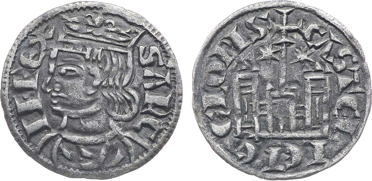 Серебро. 0,66г. Бургос. Аверс: легенда "SANC II REX". Реверс: легенда "CASTEL LELE GIONIS". AU.