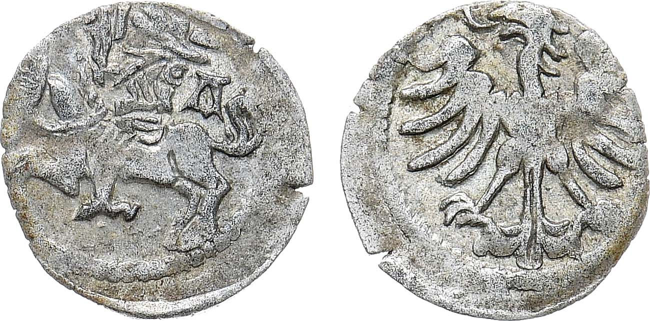 Серебро. 0,39г. Аверс: Справа от всадника "Л". Kopicki 3120 (R). AU/UNC.