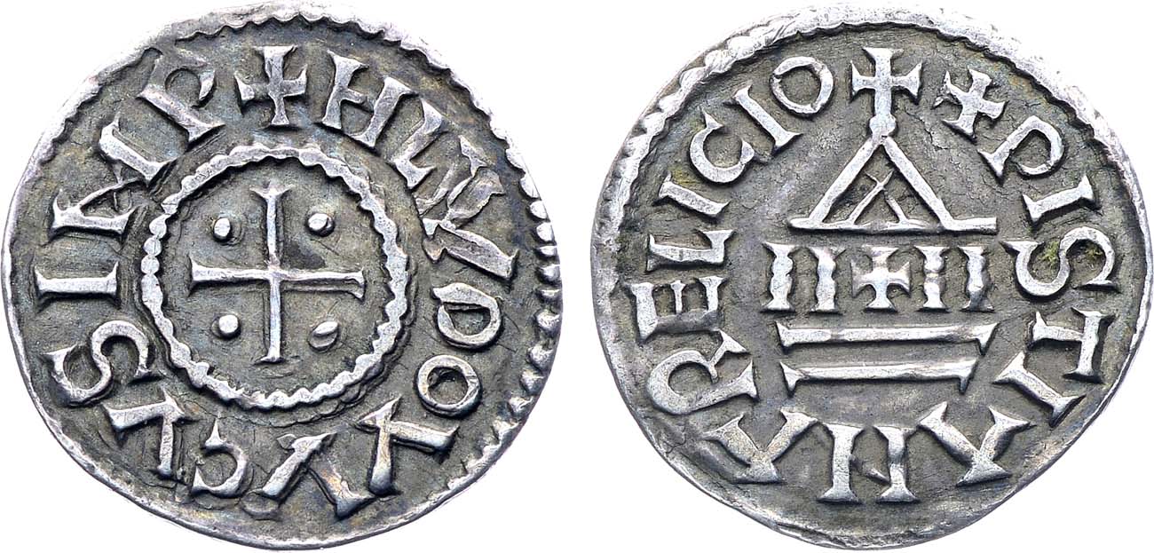 Серебро. 1,56г. Аверс: изображение креста с четырьмя точками внутри окружности; легенда "+HLVDOVVICVS IMP". Реверс: изображение церкви; легенда "XPISTIANA RELIGIO". XF/AU.
