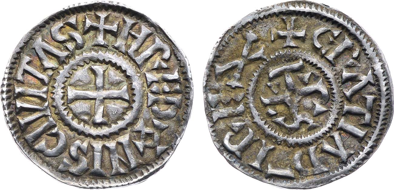 Серебро. 1,54г. Ренн. Аверс: монограмма Каролингов; легенда "GRATIA D-I REX". Реверс: крест внутри окружности; легенда "HRED NIS CIVITAS". AU.