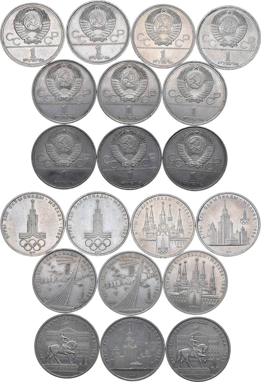 Медно-никелевый сплав. 1 рубль 1977 года. ЛМД. XXII летние Олимпийские Игры, Москва 1980 - Эмблема. КМ Y# 144. AU. (2 шт.) 1 рубль 1978 года. ЛМД. XXII летние Олимпийские Игры, Москва 1980 - Кремль. КМ Y# 153. AU. (2 шт.) 1 рубль 1979 года. ЛМД. XXII летние Олимпийские Игры, Москва 1980 - Университет. КМ Y# 164. AU. (2 шт.) 1 рубль 1979 года. ЛМД. XXII летние Олимпийские Игры, Москва 1980 - Спутник. Монумент. КМ Y# 165. AU. (2 шт.) 1 рубль 1980 года. ЛМД. XXII летние Олимпийские Игры, Москва 1980 - Памятник Ю. Долгорукому. КМ Y# 177. AU. (2 шт.) KM Y# 144. 153. 164. 165. 177.