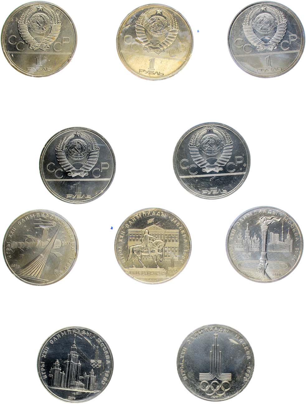 Медно-никелевый сплав. 1 рубль 1977 года. Серия Олимпиада-80. Эмблема. 1 рубль 1979 года. Серия Олимпиада-80. Здание университета им. Ломоносова. 1 рубль 1979 года. Серия Олимпиада-80. Космос. Стелла, спутник. 1 рубль 1980 года. Серия Олимпиада-80. Памятник долгорукому в Москве. 1 рубль 1980 года. Серия Олимпиада-80. Факел. Олимпийский огонь. BUNC.