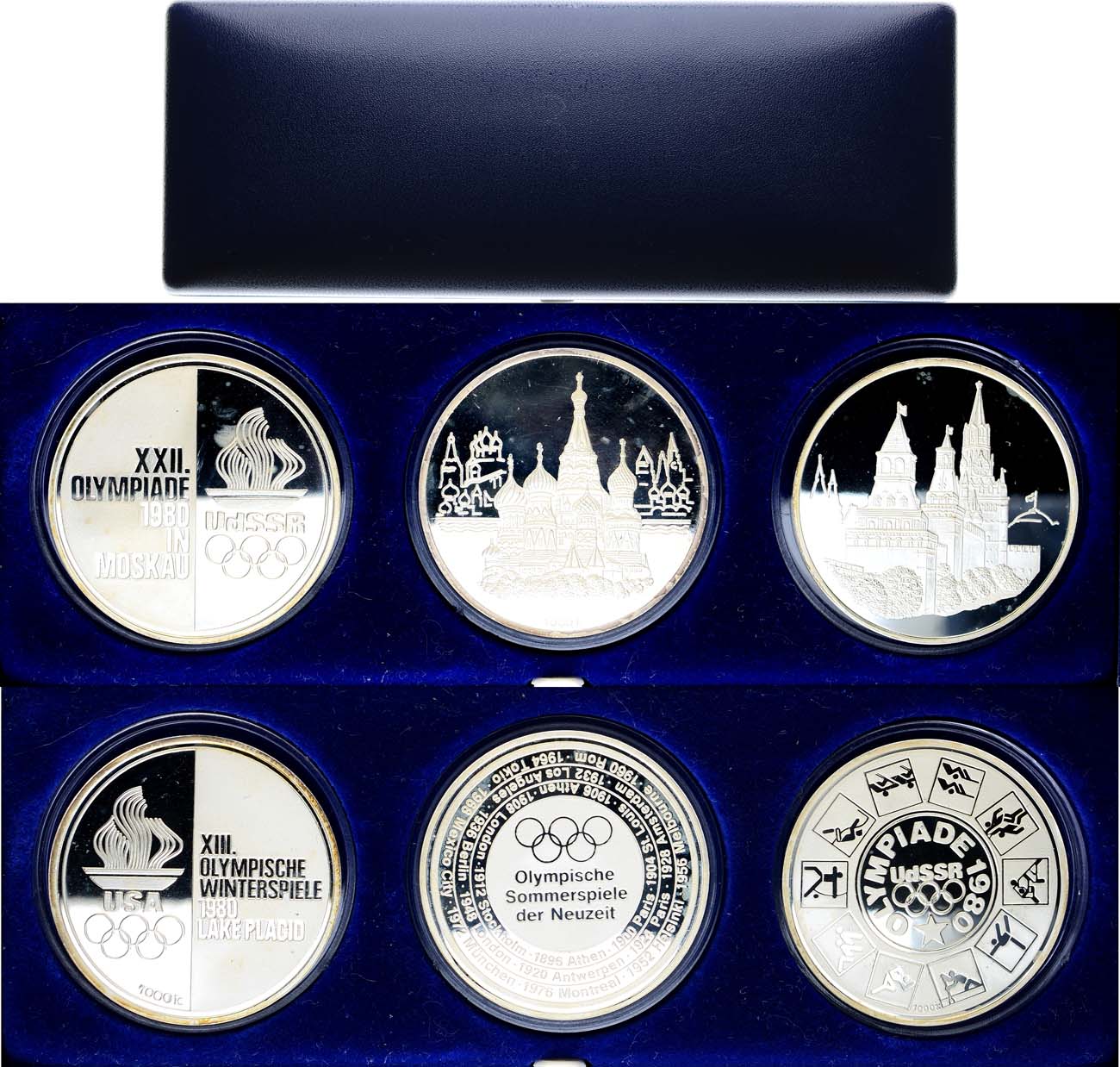 Серебро. 15г. ФРГ. Медаль 1980 года. Московский кремль. Начальная золотистая патина. PROOF. ФРГ. Медаль 1980 года. Московский кремль. XXII летние олимпийские игры. Москва-80. PROOF. ФРГ. Медаль 1980 года. XXII летние олимпийские игры. Москва-80/ XIII Зимние олимпийские игры 1980 года в Лейк-Плейсиде США. PROOF. PROOF.