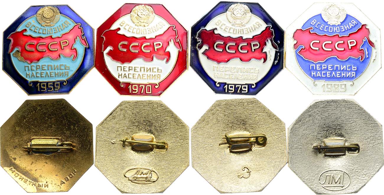 Томпак, золочение, эмаль. Значки выполнены в форме 8-гранников с застёжками. Значок "Всесоюзная перепись населения 1959". Красно-сене-голубая эмаль с золочением. На оборотной стороне "Монетный двор". UNC. Значок "Всесоюзная перепись населения 1970". Красно- белая эмаль с золочением. На оборотной стороне знак монетного двора "ЛМД" в овале. UNC. Значок "Всесоюзная перепись населения 1979". Красно-сине- белая эмаль с золочением. На оборотной стороне знак "Э". UNC. Значок "Всесоюзная перепись населения 1989". Красно-сине- белая эмаль с золочением. На оборотной стороне знак "ЛМД". UNC. UNC.