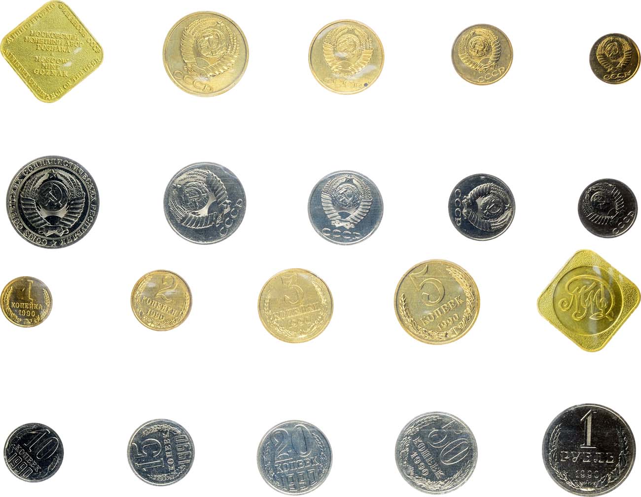 Московский монетный двор. Гибкий пластик. В набор входят: алюминиевый жетон ММД квадратной формы со скругленными краями, 1 рубль, 50 копеек, 20 копеек, 15 копеек, 10 копеек, 5 копеек, 3 копейки, 2 копейки, 1 копейка 1990 года. BU.