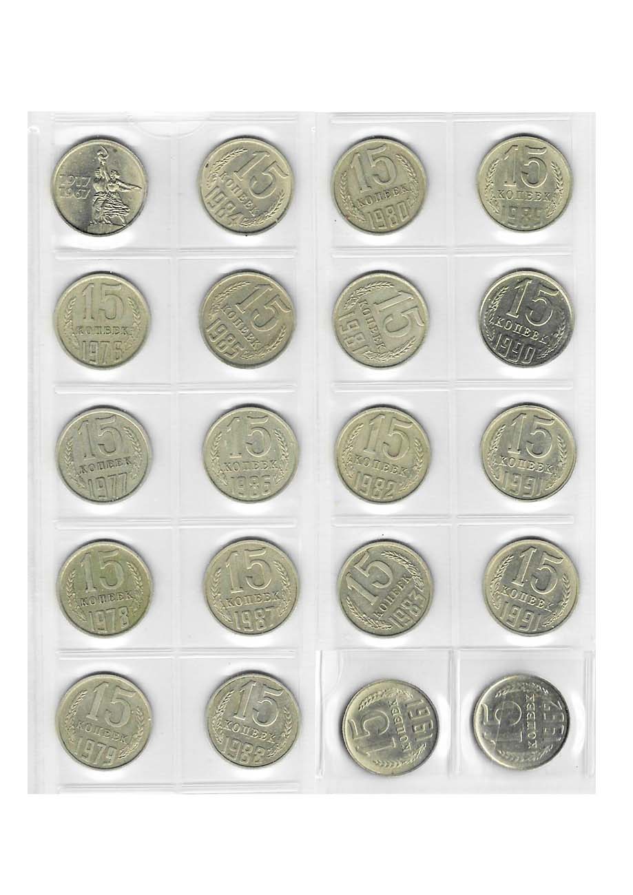 Медно-никелевый сплав белого цвета. 15 копеек 1961. 1962. 1967 (50 лет революции), 1976, 1977, 1978, 1979, 1980, 1981, 1982, 1983, 1984, 1985, 1986, 1987, 1988 ЛМД, 1989, 1990, 1991 ЛМД, 1991 ММД. XF/UNC.