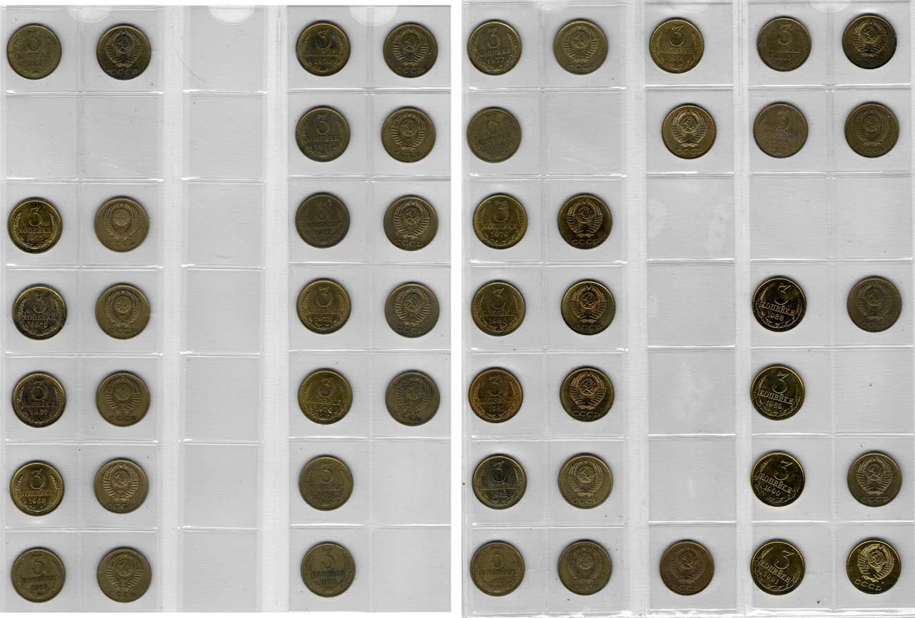 Медно-цинковый сплав. 3 копейки 1961 года (2 шт), 1965 (2 шт), 1966 (2 шт), 1967 (2 шт.), 1968 (2 шт.), 1969 (2 шт.), 1970 (2 шт.), 1971 (2 шт.), 1972 (2 шт.), 1973 (2 шт.), 1974 (2 шт.), 1975, 1976, 1977 (2 шт.), 1978, 1979 (2 шт.), 1980 (2 шт.), 1981 (2 шт.), 1982 (2 шт.), 1983 (2 шт.), 1984 (2 шт.), 1985 (2 шт.), 1986 (2 шт.), 1988 (2 шт.), 1989, 1990 (2 шт.), 1991 М (2 шт.). XF/BU.