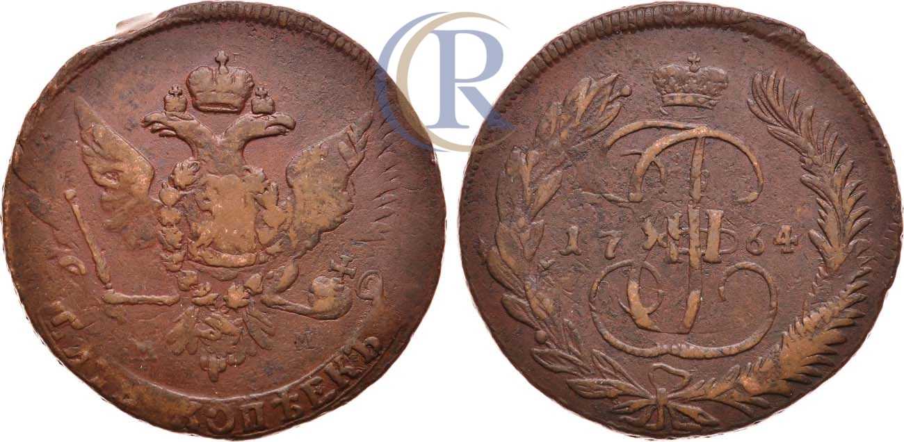 Медь. 42,84г. Красный монетный двор. Перечекан из 5 копеек образца 1763 года с переворотом заготовки. Уздеников 2649. Биткин 522. Дьяков 33, 64. Brekke 119, 201. XF .