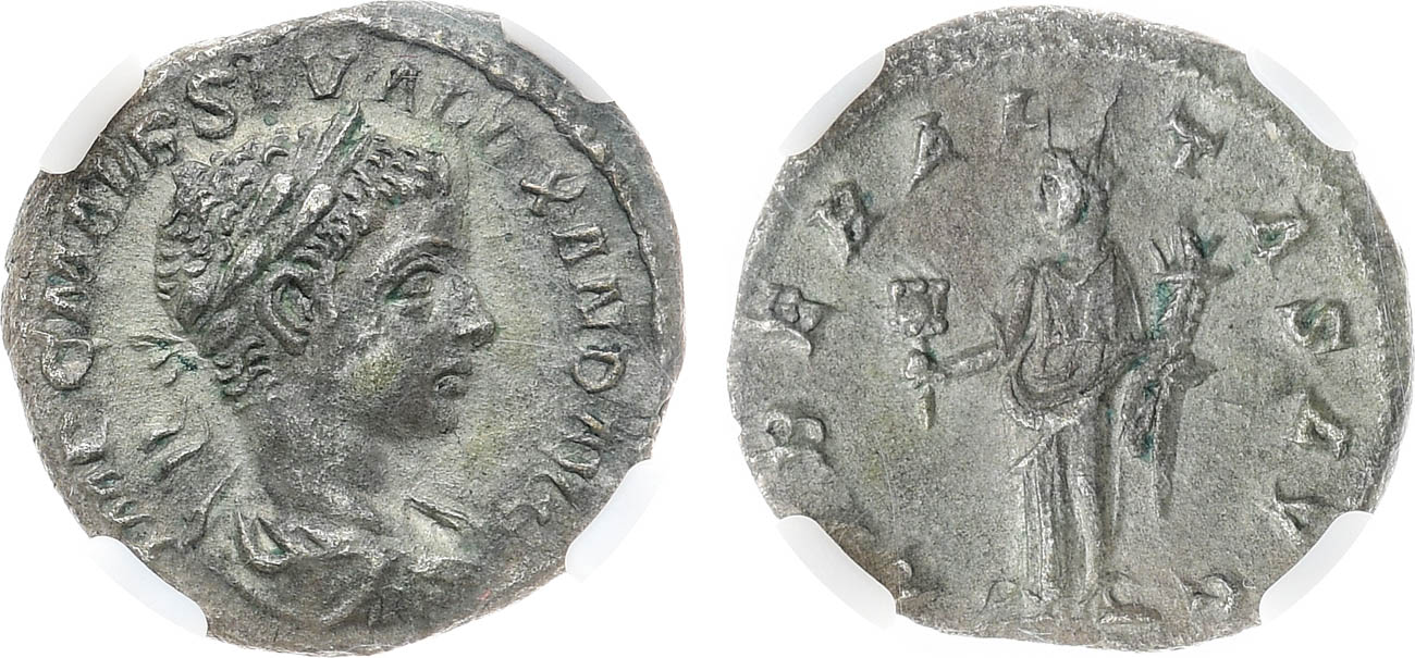 Серебро. Аверс: портрет императора вправо, латинская легенда "IMP C M AVR SEV ALEXAND AVG". Реверс: богиня Либералитас влево, в правой руке счеты, в левой руке рог изобилия, латинская легенда "LIBERALITAS AVG". RIC 148. AU DETAILS.