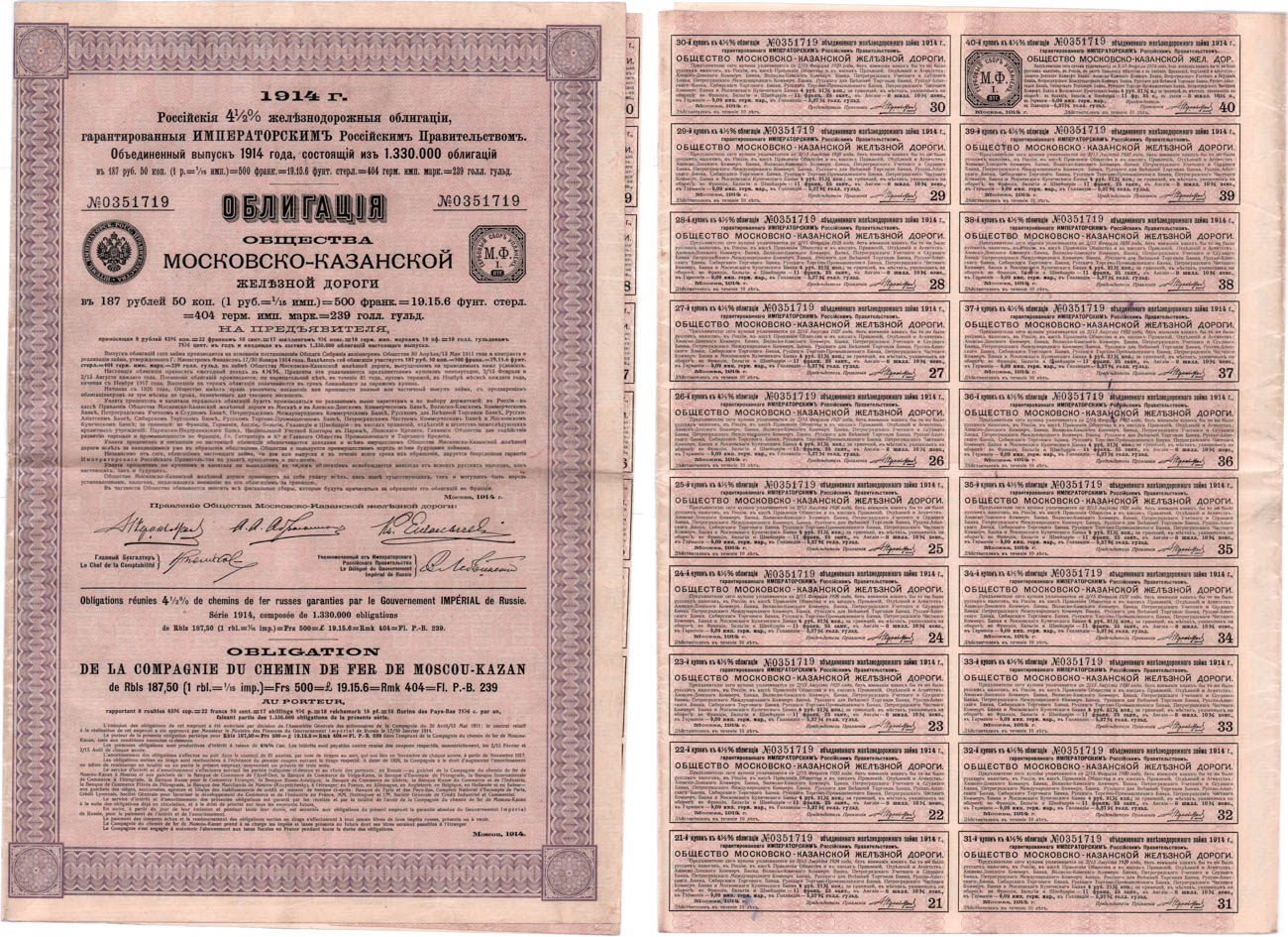 Ценные бумаги Облигация 1914 года. Общество Московско-Казанской железной дороги. Облигация 4 1/2% заём в 187 рублей 50 копеек 1914 года.