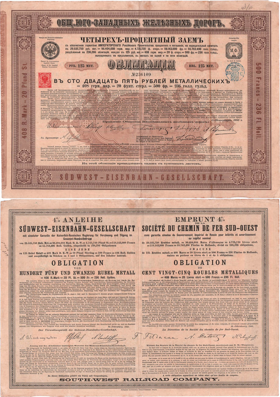 Ценные бумаги 125 рублей золотом 1885 года. Российская империя. Общество Юго-Западных железных дорог. Облигация 4% заёма в 125 рублей металлических 1885 года.