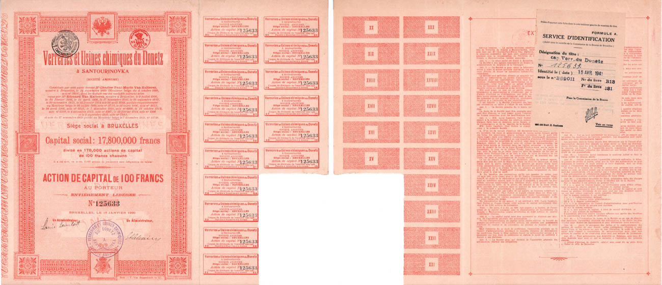 Ценные бумаги Акция 1920 года. Русско-Бельгийское. Донецкий стекольный и химический заводы в Сантуриновке. Акция на 100 франков 1920 года.