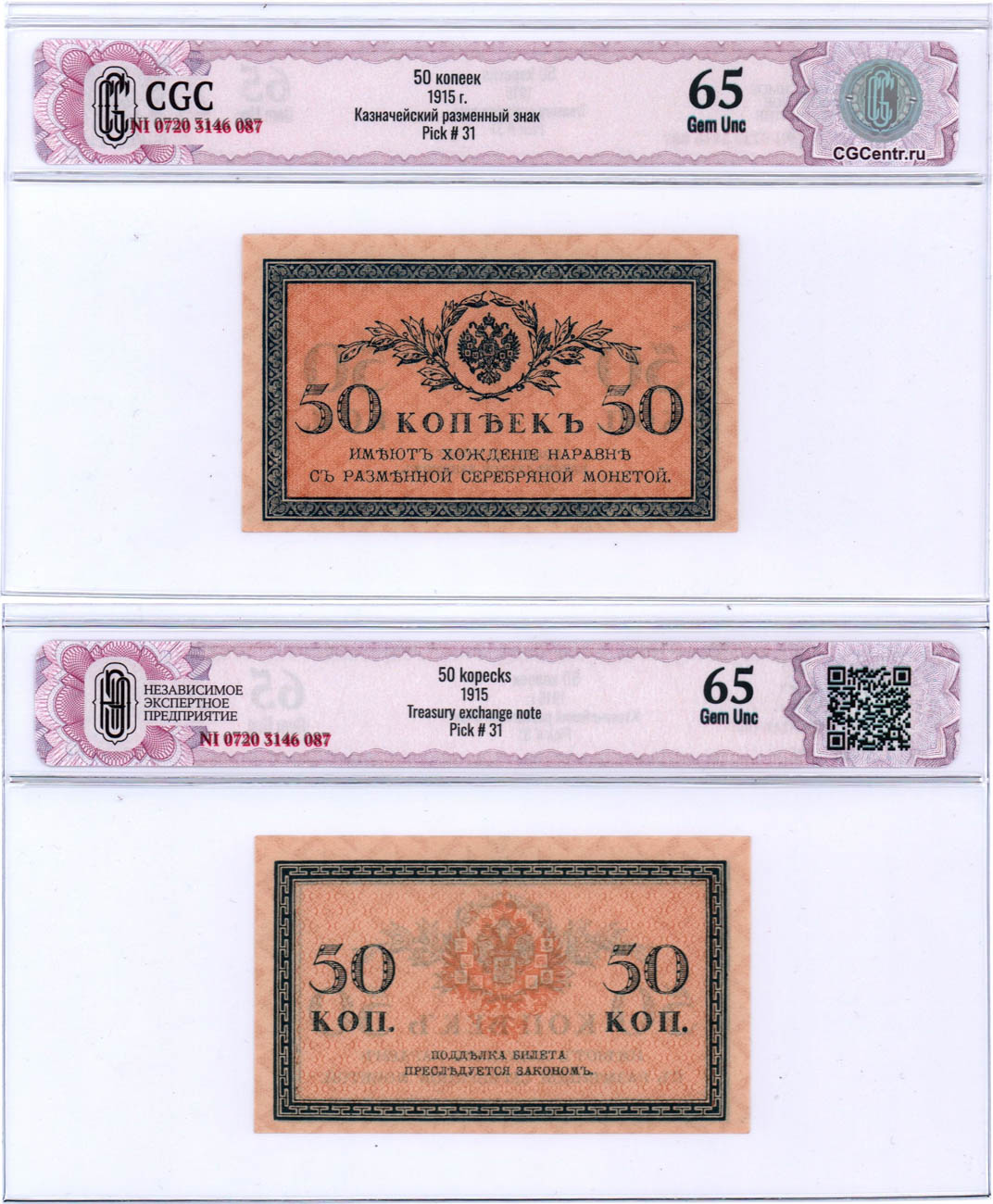Центральные выпуски 50 копеек 1915 года. Российская Империя. Разменный казначейский знак. 50 копеек образца (1915) года. В слабе CGC 65 Gem Unc.