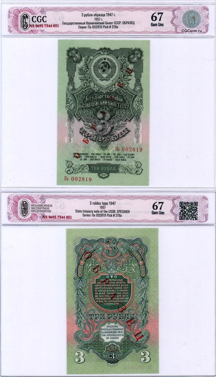 Центральные выпуски 3 рубля 1957 года. СССР. Государственный Казначейский билет. 3 рубля 1957 года. 15 лент в венке. ОБРАЗЕЦ. В слабе CGC 67 Gem Unc.