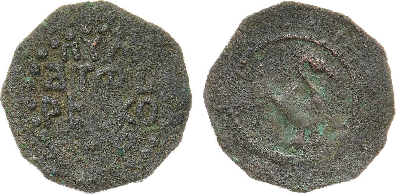Медь. 1,49г. Чеканка в Твери. Аверс: русская строчная легенда. Реверс: голова быка, точки вокруг. ГП2 7033D (R-VI). VF.