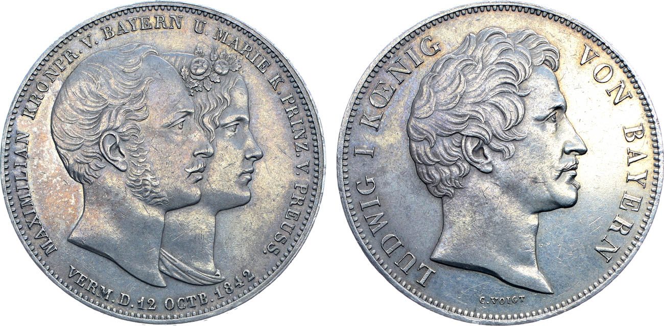 Другие страны Германия. Империя. Королевство Бавария. Король Людвиг I. 2 талера 1842 года. Свадьба наследного принца Максимилиана и Марии принцессы Прусской.