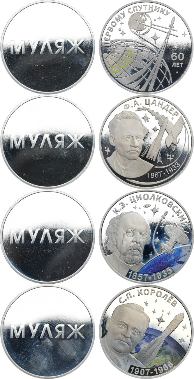 Медно-никелевый сплав. Московский монетный двор. Диаметр 38 мм. 20 рублей 2017 года. 60 лет запуска первого искусственного спутника Земли. МУЛЯЖ. Эмаль. 24,57 г. Аверс: гладкий кружок с надписью "МУЛЯЖ". Реверс: как у тиражной монеты. 20 рублей 2017 года. 130 лет со дня рождения Цандера Ф.А. МУЛЯЖ. 24,68 г. Аверс: гладкий кружок с надписью "МУЛЯЖ". Реверс: как у тиражной монеты. 20 рублей 2017 года. 160 лет со дня рождения Циолковского К.Э. МУЛЯЖ. Эмаль. 24,71 г. Аверс: гладкий кружок с надписью "МУЛЯЖ". Реверс: как у тиражной монеты. 20 рублей 2017 года. 110 лет со дня рождения Королёва С.П. МУЛЯЖ. Эмаль. 24,40 г. Аверс: гладкий кружок с надписью "МУЛЯЖ". Реверс: как у тиражной монеты. BU.