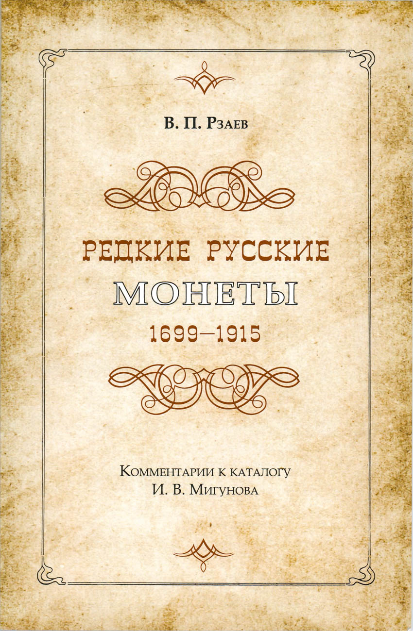 Москва, 2017 г. 178 стр. Автор сто лет спустя подвергает глубокому анализу работу И.В.Мигунова и на основе своего исследования переопределяет редкие нумизматические объекты, отделяя фантазийные подделки, новоделы и спецзаказы, выясняя их текущую ценность и стоимость. Во второй части книги факсимильным способом воспроизведено оригинальное издание И.В. Мигунова 1915 года.
