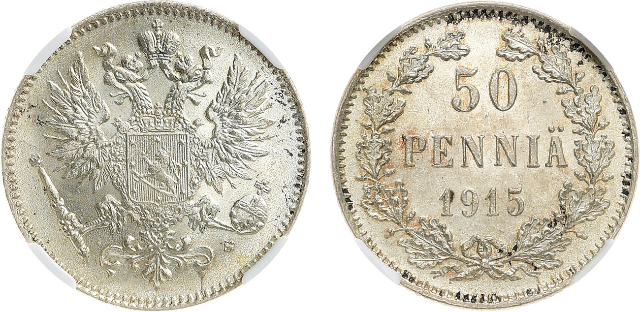 Серебро. Для Финляндии. Гельсингфорсский монетный двор. Уздеников 4825. Биткин 406. Казаков 490. MS 66.