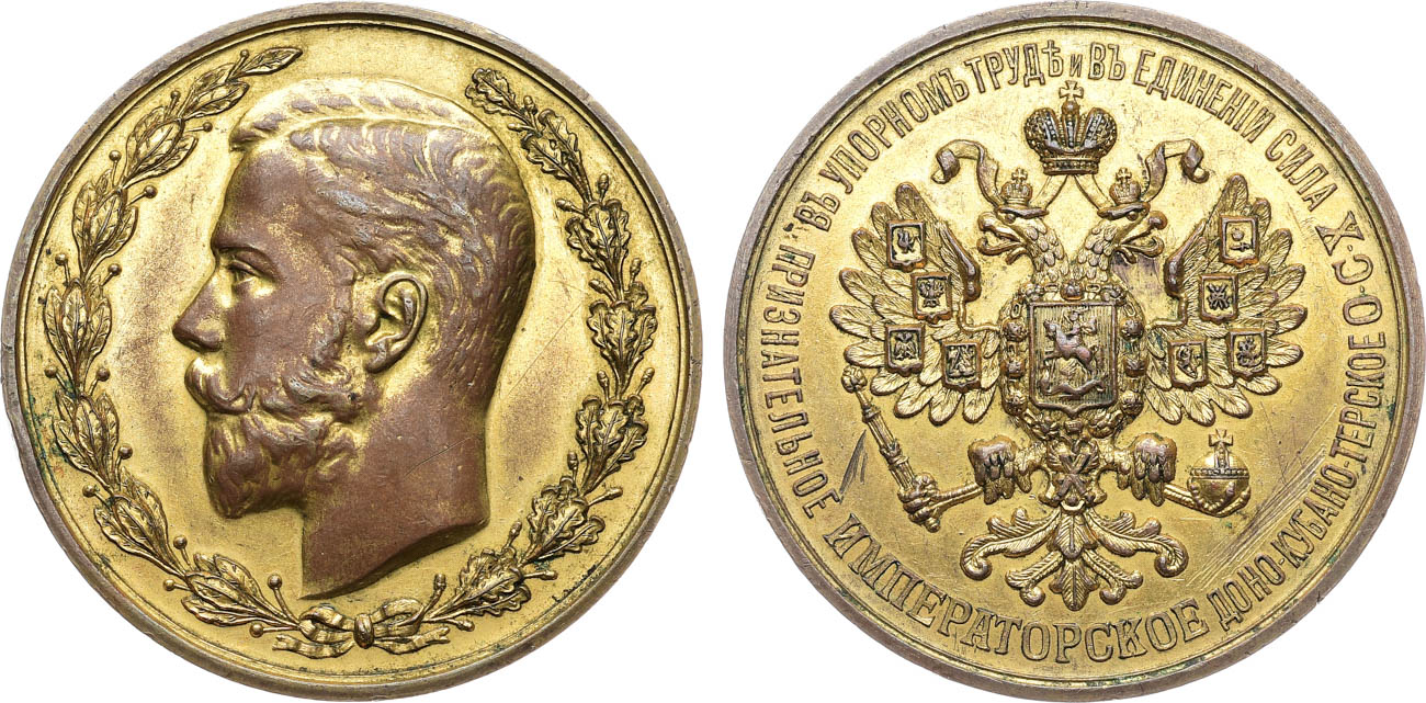 Бронза, золочение. 26,96г. Диаметр 39,65 мм. Российская Империя, начало XX в. Неизвестная мастерская. Без подписи медальера. Аверс: портрет императора Николая II в центре лаврово дубового венка. Реверс: малый государственный герб Российской империи (двуглавый орёл), надпись по кругу "В УПОРНОМЪ ТРУДЕ И ВЪ ЕДИНЕНIИ СИЛА / ПРИЗНАТЕЛЬНОЕ ИМПЕРАТОРСКОЕ ДОНО-КУБАНО-ТЕРСКОЕ О.С.Х». Дьяков 1471.1(R1). AU.