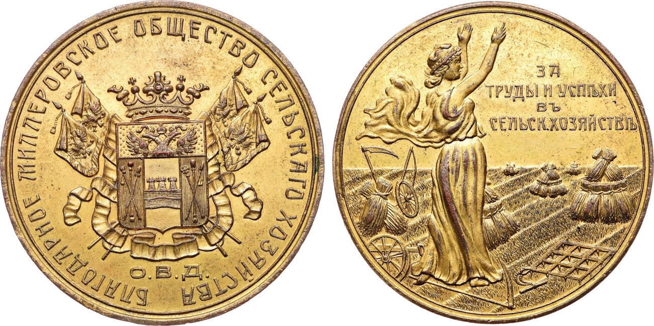 Бронза, золочение. 62,35г. Диаметр 48 мм. Российская Империя, начало XX в. Неизвестная мастерская. Без подписи медальера. Аверс: герб области Войска Донского, под ним надпись "О.В.Д.", по окружности надпись "БЛАГОДАРНОЕ МИЛЛЕРОВСКОЕ ОБЩЕСТВО СЕЛЬСКОГО ХОЗЯЙСТВА". Реверс: богиня плодородия Цецера, воздевшая руки к небу, у её ног коса и борона, стоит на убранном поле пшеницы, справа надпись в четыре строки "ЗА | ТРУДЫ И УСПѢХИ | ВЪ | СЕЛЬСК.ХОЗЯЙСТВѢ". Букатина 76.1. Дьяков 1464.2(R2). AU.