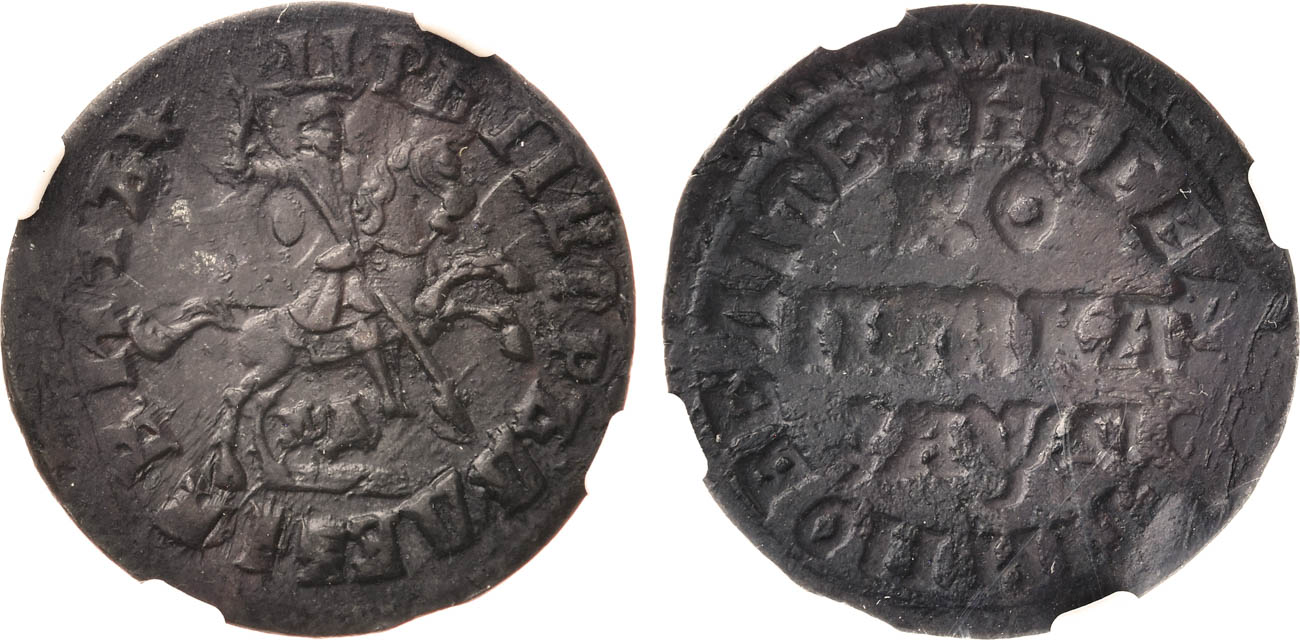 Медь. Набережный монетный двор. Всадник на вздыбленном коне, земля под конём. Аверс: в конце круговой надписи звезда, буква монетного двора "М" малая. Уздеников 2349. Биткин 3501. Дьяков 133, 3646(R0). Brekke 32, 234. AU 58 BN.