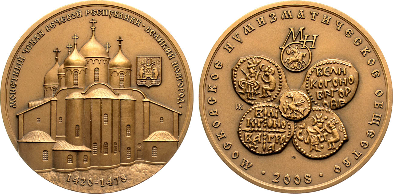 Современная Россия Медаль 2008 года. Московского Нумизматического Общества (МНО). Монетный чекан вечевой Республики Великий Новгород 1420-1478 гг.