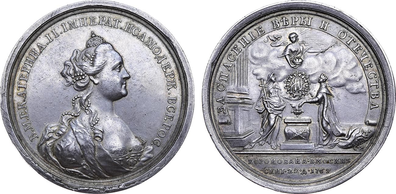 Коронационные медали императрицы, свергнувшей мужа, по понятным причинам изготавливались в спешке. Тем не менее, на пиру в Грановитой палате гостям были розданы отчеканенные свидетельства коронации 1762 г. Аверс работы Тимофея Иванова изображает традиционный профиль правительницы в короне. На реверсе Самойла Юдин изобразил императрицу и Деву Марию стоящими по бокам от алтаря, ангел с небес протягивает им корону. Надпись вверху – «За спасение веры и отечества».