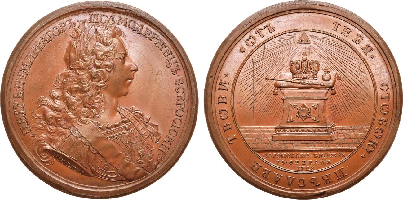 В 1728 г. Антон Шульц, еще при Екатерине I ставший ведущим придворным медальером, вырезал медаль «В память коронации Императора Петра II». Чеканили из золота, серебра и бронзы. На лицевой стороне изображен парадный портрет юного императора – правый профиль, в парике с лавровым венком, в рыцарских доспехах и с орденской лентой. На обороте лучи освещают лежащие на постаменте корону, скипетр и державу. Известны также копии авторства Калашникова и других мастеров.