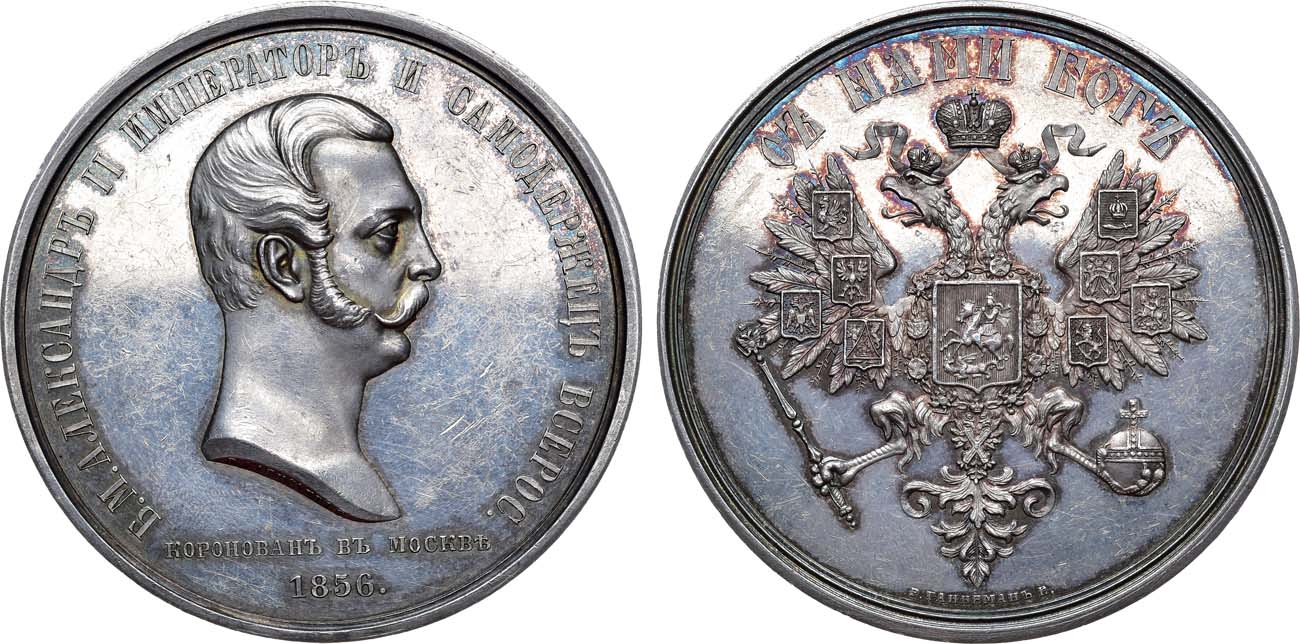 Фото - Медаль 1856 года. В память коронации Императора Александра II. Серебро. 68,12г. Диаметр 50,5 мм. Очный аукцион "Редкие Монеты" №45, июнь 2025 года, лот 637.