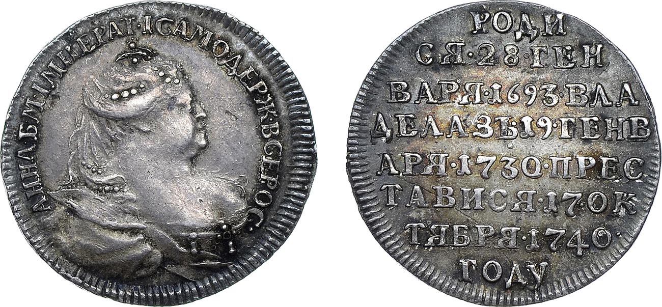 На аверсе правый профиль императрицы в короне и мантии. Надпись по кругу «АННА Б • М • IМПЕРАТРИЦА ИСАМОДЕРЖ • ВСЕРОСС •». Реверс занимает надпись в 8 строк «РОДИ | СЯ • 28 • ГЕН | ВАРЯ • 1693 ВЛА | ДЕЛА • ЗЪ 19 ГЕНВ | АРЯ • 1730 ПРЕС | ТАВИСЯ • 17 ОК | ТЯБРЯ • 1740 | ГОДУ».