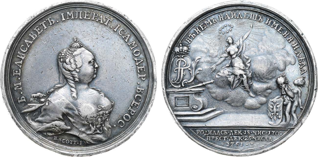 Фото - Медаль 1761 года. В память кончины Императрицы Елизаветы Петровны. Серебро, 41 мм. Медальер Скотт.Аукцион "Редкие Монеты" №48.1, март 2026 года, лот 72.